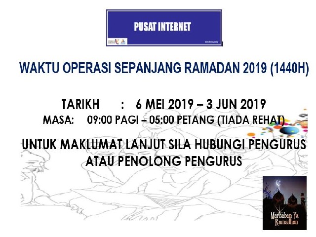 6 May 2019 | Aktiviti TerkiniBerikut adalah Notis Waktu Operasi Pusat Ekonomi Digital Tanjung Piai pada bulan Ramadhan bermula 6 Mei - 3 Jun 2019