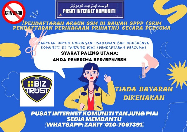 11 September 2021 | Aktiviti TerkiniPada 10 September 2021, Pengurus PIK Tanjung Piai telah membantu seorang peniaga dan usahawan tempatan iaitu Puan AmiraKasira Mohd Zamri mengenai proses pendaftaran SSM. Beliau merupakan usahawan yang menjual produk berasaskan makanan seperti makanan bergoreng dan minuman seperti ice-blended. Beliau juga menjual produknya secara atas talian menggunakan platfom media sosial seperti Facebook, Whatsapp dan Instagram. Oleh yang demikian, Puan Amira merasakan peri pentingnya untuk mempunyai lesen perniagaan SSM bagi membolehkan beliau memohon sebarang bantuan sekiranya bersesuaian.