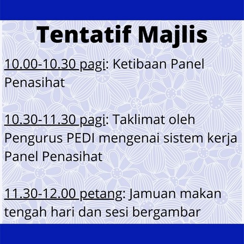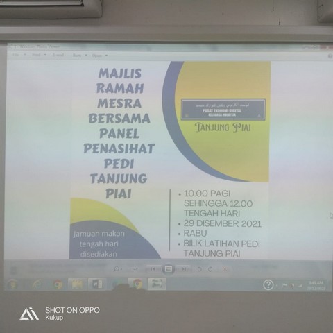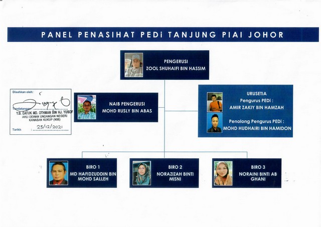 30 Disember 2021 | Aktiviti TerkiniMajlis ramah mesra bersama panel penasihat PEDi Tanjung Piai telah diadakan dengan jayanya pada 29 Disember 2021 iaitu pada hari rabu. Majlis ramah mesra telah dianjurkan bertujuan untuk berkenal-kenalan, merapat hubungan silaturahim selain bermotifkan untuk menjayakan agenda yang dikelolakan oleh PEDi Tanjung Piai. Majlis ini telah dihadiri oleh empat panel penasihat iaitu Encik Zool Shuhaifi Hassim selaku Penghulu dan Pengerusi Panel Penasihat PEDi, Encik Mohd Rusly bin Abas selaku Naib Pengerusi, Encik Mohd Hafidzuddin Mohd Salleh selaku Biro 1 dan Puan Noraini binti Ab Ghani selaku Biro 3. Turut sama menyertai majlis ini adalah Pengurus PEDi yang bertindak selaku pengacara dan Penolong Pengurus PEDi sebagai urus setia.