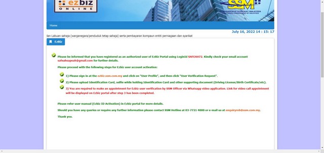 Justeru, pengaktifan akaun Ezbiz ini amat penting dan memudahkan Puan Safe’ah tanpa beliau perlu ke cawangan atau pejabat SSM yang berdekatan. Melalui akaun Ezbiz juga, Puan Safe’ah boleh memperbaharui lesen SSM sekiranya tamat tempoh, menambah bilangan cawangan, bilangan rakan kongsi sehingga proses penamatan perniagaan. Walau bagaimanapun, Puan Safe’ah telah diarahkan untuk bersedia bagi tujuan pengesahan identiti melalui panggilan video menggunakan aplikasi Whatsapp. Hal ini merupakan tatacara baru yang disediakan oleh pihak SSM untuk seseorang yang ingin mengaktifkan akaun Ezbiz miliknya.