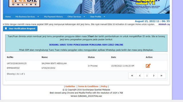 Beliau telah hadir dengan membawa segala dokumen yang diperlukan seperti kad pengenalan, lesen memandu dan butiran maklumat peribadi yang lain. Puan Salimah juga telah diterangkan secara terperinci mengenai Skim Pendaftaran Perniagaan Prihatin ini yang selama ini belum beliau ketahui. Pengurus PEDi juga telah menerangkan kepada beliau tentang konsep janji temu dan Kod QR SSM BizTrust. Temu janji beliau telah diaturkan pada 29 Ogos 2022 iaitu pada hari isnin.