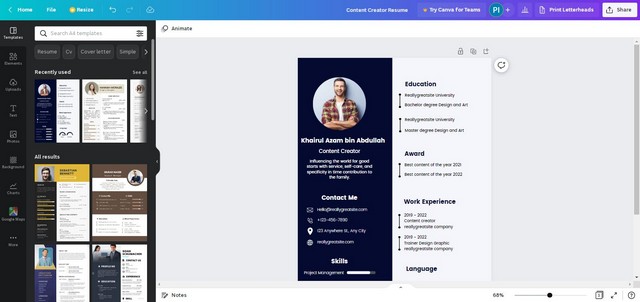 Melalui aplikasi Canva, beliau ditunjukkan kaedah untuk memilih template yang sesuai dengan cita rasa beliau memandangkan banyak pilihan yang disediakan. Setelah memilih template yang bersesuaian, beliau mengisi segala maklumat asas dan butiran peribadi sehingga ke proses percetakan. Kelas ini berakhir sepenuhnya pada jam 3.00 petang. Di samping itu, beliau juga didaftarkan sebagai ahli baru di PEDi Tanjung Piai.
