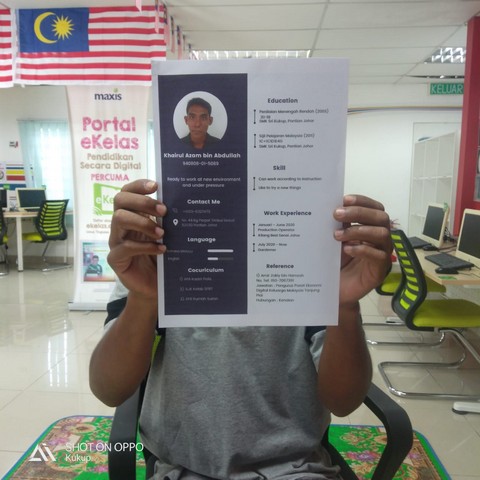 17 Ogos 2022 | Aktiviti TerkiniEncik Khairul Azam bin Abdullah telah hadir ke PEDi Tanjung Piai untuk dibantu oleh Pengurus PEDi bagi membuat resume milik beliau. Beliau telah hadir pada 16 Ogos 2022 bersamaan hari selasa pada jam 2.00 petang. Oleh yang demikian, Pengurus PEDi telah mengajar beliau untuk membuat resume secara ringkas dan menarik menggunakan aplikasi Canva. Beliau memaklumkan bahawa beliau ingin memohon kerja di tempat yang baru namun perlu menghantar resume beliau yang terkini.