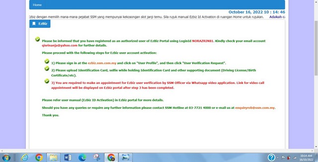 Beliau diterangkan mengenai satu skim iaitu Skim Pendaftaran Perniagaan Prihatin (SPPP) yang masa kini sedang giat dijalankan oleh pihak SSM. Melalui SPPP ini juga membolehkan Puan Norazrin menikmati pengecualian fi seandainya berkelayakan. Di samping itu, beliau diterangkan tentang proses janji temu yang telah ditetapkan oleh pihak SSM. Tujuannya adalah untuk pengesahan identiti sebelum diteruskan ke proses yang seterusnya.