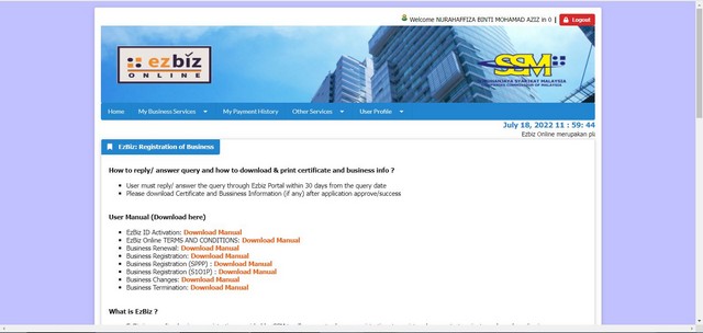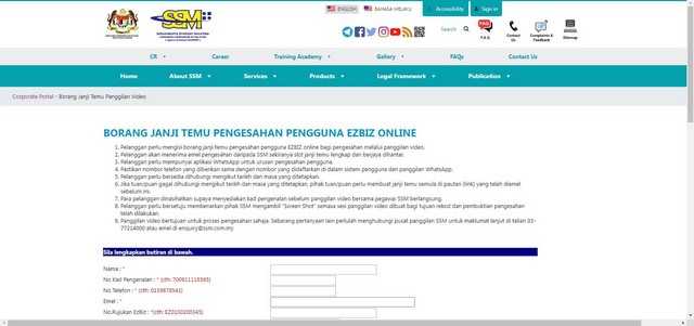 Proses permulaannya adalah seperti biasa dengan mendaftarakan akaun beliau terlebih dahulu melalui Ezbiz SSM. Dokumen peribadi seperti kad pengenalan, lesen memandu, nama emel, penciptaan username dan password serta gambar bersama kad pengenalan turut sama diberikan dalam proses awal pendaftaran. Sesudah itu, beliau dikehendaki untuk membuat janji temu melalui panggilan video bersama pegawai SSM bagi tujuan pengesahan akaun.