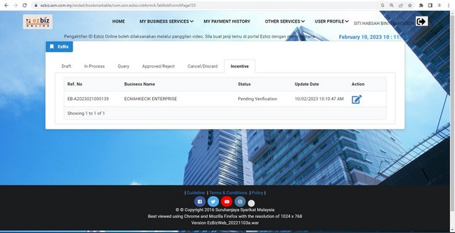 11 Februari 2023 | Aktiviti TerkiniPuan Siti Habsah binti Samsudin telah menghubungi Pengurus PEDi untuk membantu beliau mendaftarkan lesen perniagaan SSM milik beliau. Hal ini demikian kerana, beliau sudah lamaningin mendaftarkan perniagaan beliau namun mengalami sedikit kekangan dari segi urusan masa dan perjalanan untuk membuatnya.
