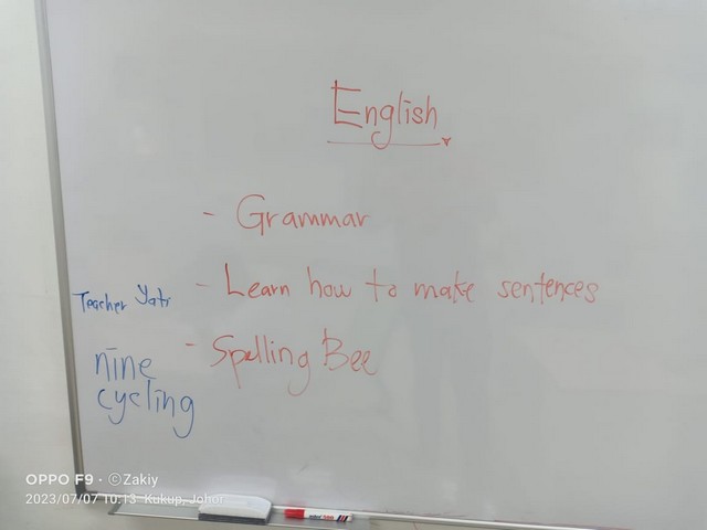 8 Julai 2023 | Aktiviti TerkiniPada 7 Julai iaitu bersamaan hari ahad, penolong pengurus PEDi kembali membimbing adik Muhammad Shahrul Aziem Mohd Shamsul mengenai e-pembelajaran bahasa Inggeris. Kelas bimbingan ini dijalankan pada jam 10.00 pagi sehingga 12.00 di dalam bilik latihan. Kelas pada kali ini memfokuskan kepada pengajaran (Grammar, Learn How to Make Sentences and Spelling Bee). Pembelajaran secara santai ini membolehkan adik Aziem secara perlahan-lahan dapat menguasai asas pembelajaran Bahasa Inggeris secara sistematik.