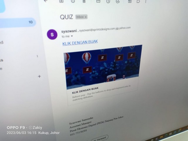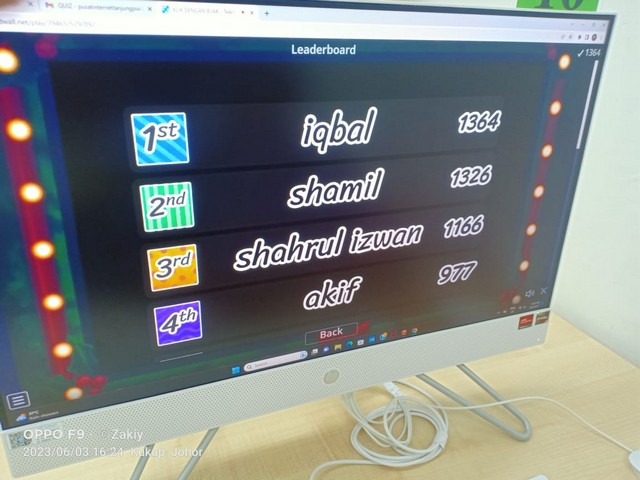 4 Jun 2023 | Aktiviti TerkiniPengurus PEDi telah mengadakan kuiz digital yang bertemakan Klik Dengan Bijak (KDB) bersama empat orang pelajar. Kuiz ini dijalankan pada 3 Jun 2023 bersamaan hari sabtu di bilik latihan PEDi Tanjung Piai. Kuiz KDB yang diketengahkan adalah berpandukan kepada pemilihan jawapan yang telah disediakan. Para pelajar hanya perlu klik dan memilih jawapan yang betul tanpa perlu masa yang lama.