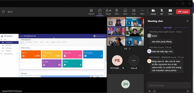 Taklimat dimulakan dengan pengenalan taklimat oleh Puan Maznah kemudiannya disambung oleh Puan Haryati dari PEDi Presint 18 Putrajaya. Sistem terbaru yang dibangunkan ini sememangnya memudahkan kerja petugas-petugas PEDi daripada menghantar laporan secara bulanan kepada kemasukan data setiap hari. Taklimat yang dimulakan pada jam 2.30 petang berakhir pada jam 4.30 petang.