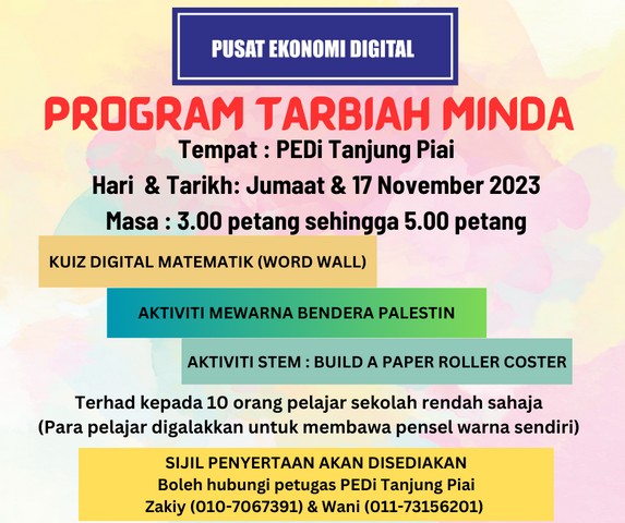 18 November 2023 | Aktiviti TerkiniPada 17 November 2023 bersamaan hari jumaat telah berlangsunya satu program yang digelar sebagai Tarbiah Minda di PEDi Tanjung Piai. Program ini telah berlangsung pada jam 3.00 petang sehingga 5.30 petang dan telah dihadiri oleh 14 orang pelajar sekolah rendah. Program Tarbiah Minda ini memfokuskan kepada tiga aktiviti iaitu Kuiz Digital Matematik, Mewarna Bendera Palestin dan aktiviti STEM (Build A Paper Roller Coaster).