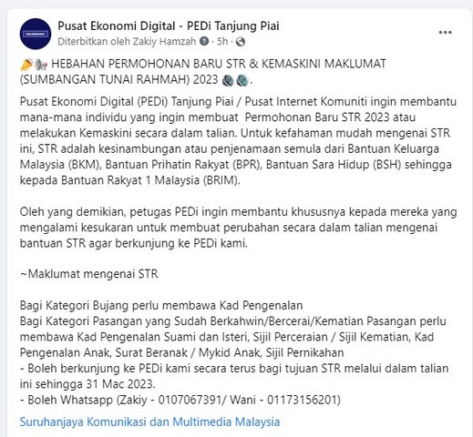 1 April 2023 | Aktiviti TerkiniPEDi Tanjung Piai telah melakukan inisiatif tambahan dengan membuat hebahan mengenai permohonan baru dan kemaskini mengenai Sumbangan Tunai Rahmah (STR) 2023. STR yang telah dijenamakan semula dari Bantuan Keluarga Malaysia (BKM) ini boleh dilakukan secara dalam talian atau pun penghantaran secara manual. Memandangkan STR ini boleh dilaksanakan secara dalam talian maka PEDi Tanjung Piai telah giat membantu penduduk kampung untuk mengemaskini permohonan mereka tanpa perlu ke LHDN.