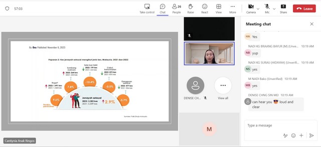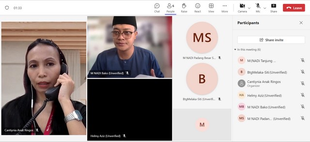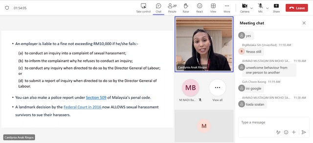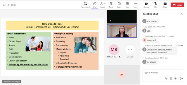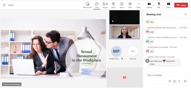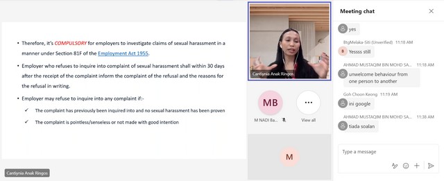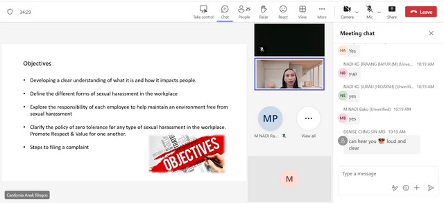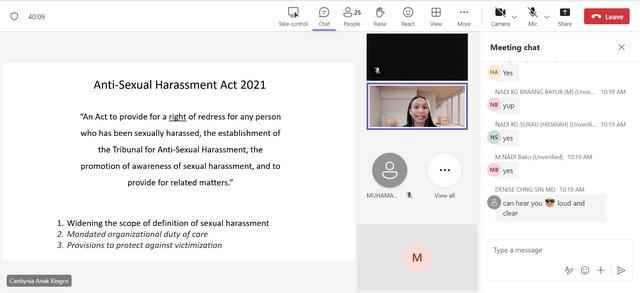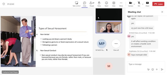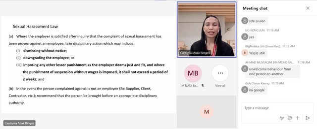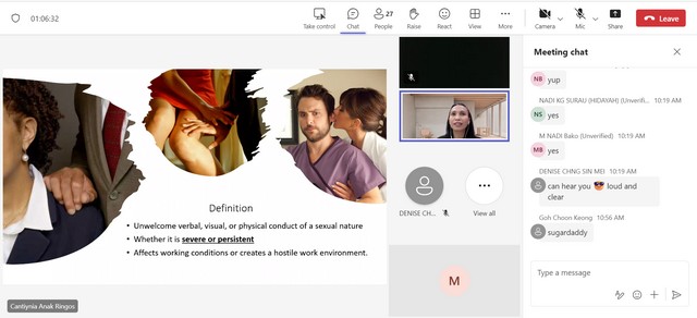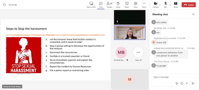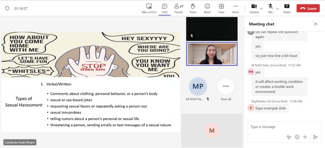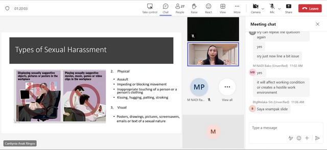 23 April 2024 | Aktiviti TerkiniPada 22 April 2024, satu sesi taklimat telah diadakan secara dalam talian menggunakan platform Microsoft Team bertajuk Sexual Harrasment at The Workplace. Taklimat ini disampaikan oleh Cantiynia Anak Ringos dari pihak RedTone dan telah dihadiri oleh 27 orang peserta daripada pihak RedTone dan petugas NADI. Taklimat yang disampaikan amatlah menarik berkisar topik dengan gangguan seksual sehingga contoh yang diberikan berpandukan kisah benar.