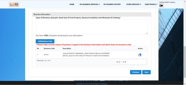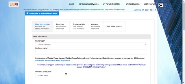 Beliau telah diterangkan dengan langkah yang pertama iaitu perlu menjalani sesi panggilan janji temu melalui video Whatsapp terlebih dahulu sebelum mengisi butiran maklumat perniagaan yang lain. Proses pendaftaran memakan masa lebih kurang satu jam dan Puan Sariah ingin menggunakan nama AcaiTeng Resources sebagai nama syarikat milik beliau.